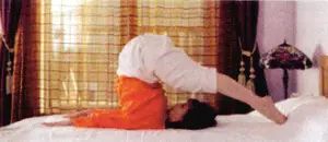 雙腿上舉90度,雙手扶在後腰處,緩慢地將背部立起,雙腿朝地面方向下落,腳尖點地,頭、肩保持不動,下巴內收,雙腿自然伸直,雙手掌心向下,按壓地面,身體一定要保持好平衡。
