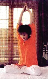 吸氣,緩慢將手向上延伸,打開肩、胸,拉伸腹背,頭部下垂,動作到位後多停留片刻,把注意力集中在小腹的呼吸上。