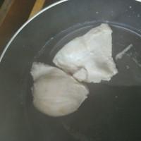 4.雞胸肉切小一點,鍋里放一片姜,一湯匙料酒,煮熟。